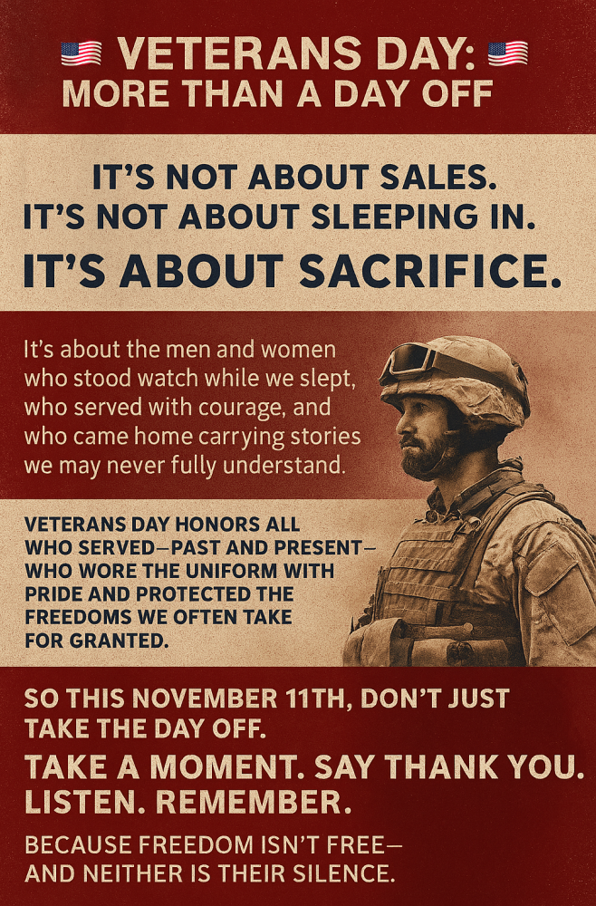 Veterans Day is a chance to reconnect with the values of courage, duty, and honor. It’s a moment to remember that behind every freedom we enjoy is someone who stood ready to defend it. So this November 11th, don’t just take the day off—take a moment. Say thank you. Listen. Remember.