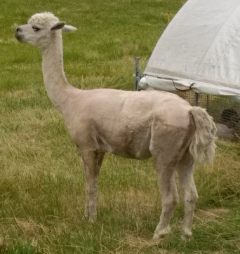 Bart has blue eyes and is a white alpaca. These two characteristics in alpacas are often related to another gene - Bart is deaf. This is probably the reason he was fighting with the other alpacas. Another shearer attempted to shear this alpaca last year but without a table, it was impossible.