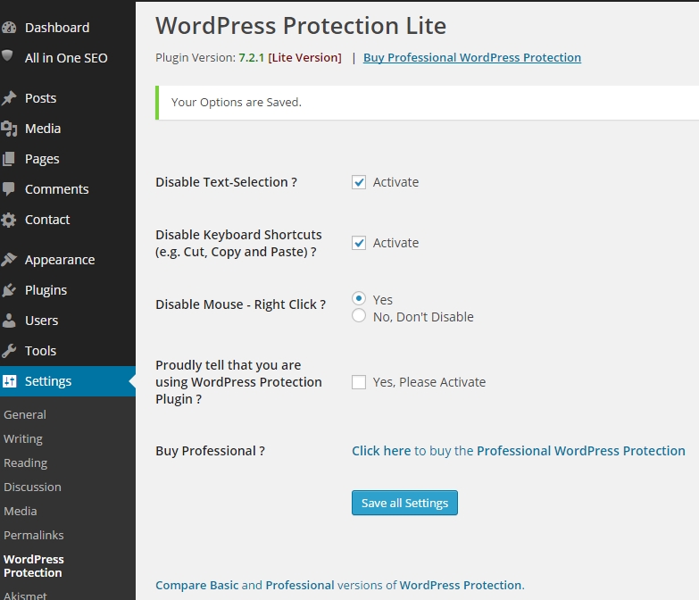 Once the plugin is installed, you’ll find the settings under WP Dashboard --> Settings --> WordPress Protection.