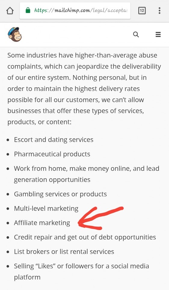 Good points all. Have been using the MailChimp "carefully" for a short while now, easy to use and the 2,000 user list is an attractive lead-in, but they seem to be missing the mark with their concept of affiliate marketing being a no-no.