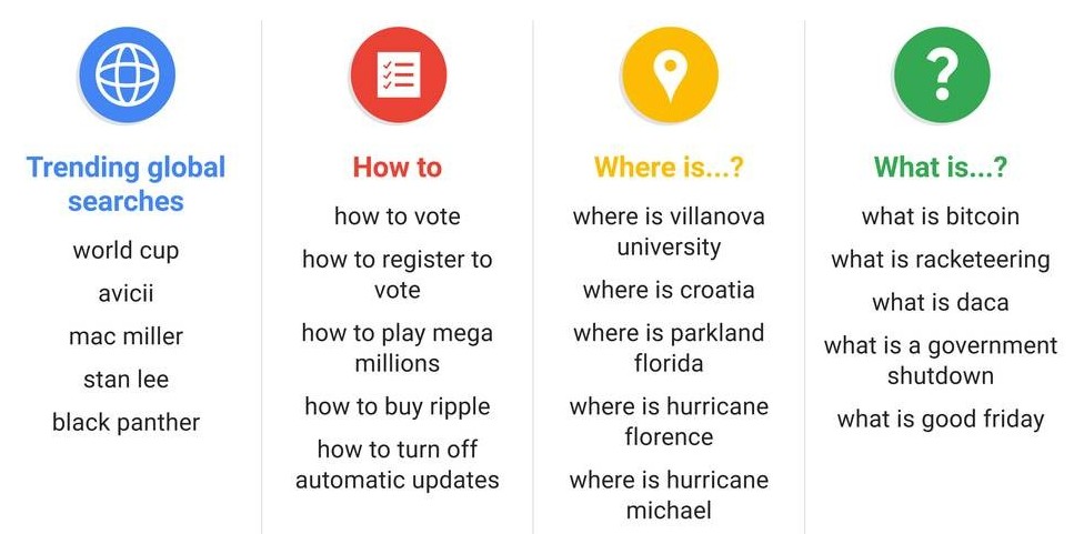 According to an article written in SEO (Search Engine Watch) the top ranking searches in Google for 2018 were: