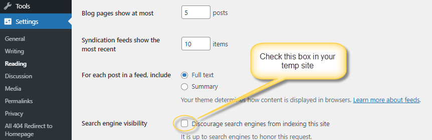 4.2 The next thing you should do in this step is going to your Dashboard and click on Setting --> Reading --> check the box that says 'Discourage search engines from indexing this site'. This is basically the same as step 1.2.