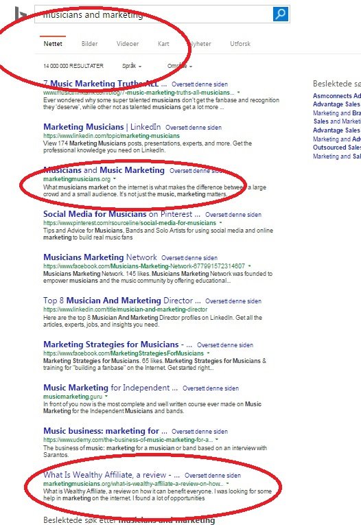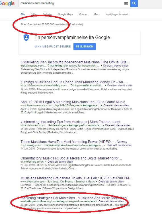 I did the search (incognito, and after cleaning all cookies, of course) for "musicians and marketing", since that's what my site is about. I found nothing on the important pages (1-3) in Google, but I have a habit of checking the first 10, just to keep up the hope. On page ten I found one of my blogpost, and of course, I smiled. At least it was there, as number 100 out of 27 700 000 hits. Not too bad, and it will move on, I'll see to that.