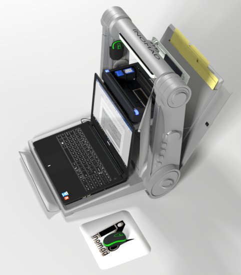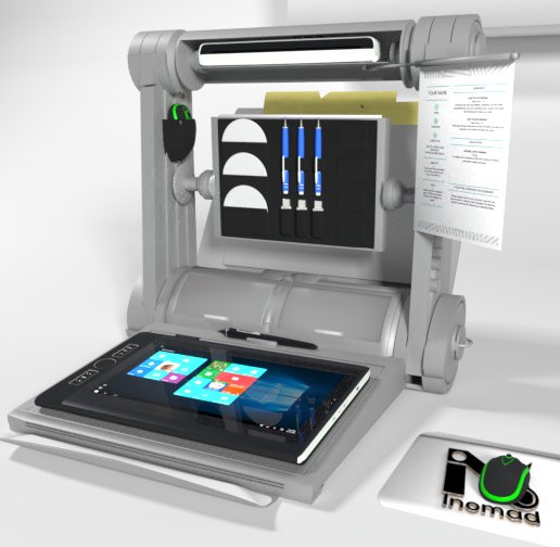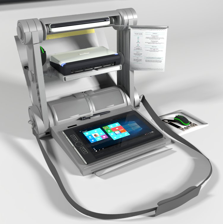I set out to design a universal mobile office case that was lightweight, compact and rugged and could carry a laptop, printer, scanner, copier and neat receipt scanner. And so the inomad was conceptualized. At a size similar to a standard size brief case and weighing under 20 lbs with all devices, The inomad provides instant "open-n-work" and "close-n-go" work sessions keeping the focus on the work-at-hand and not on repetitive setup and close down tasks. Imagine opening the inomad to a laptop, and primera trio--printer, scanner, copier, and neat receipt scanner already hooked up and in perfect position to begin working. Whats more if the user is a presenter, they could swap out the printer with a mobile digital presenter and be ready to present in a meeting moments after opening the case. Also, if the user is a car designer, or a caricature artist or animator, or a designer, they could swap out the laptop for a wacom studio pro digital tablet. The inomad laptop base has adjustable tilts for perfect ergonomic work settings which would seamlessly work perfect with a wacom tablet. My goal is to have a prototype made and campaigned on kickstarter within this year! Would love to hear your thought or comments, and suggestions to improve this are very welcome.