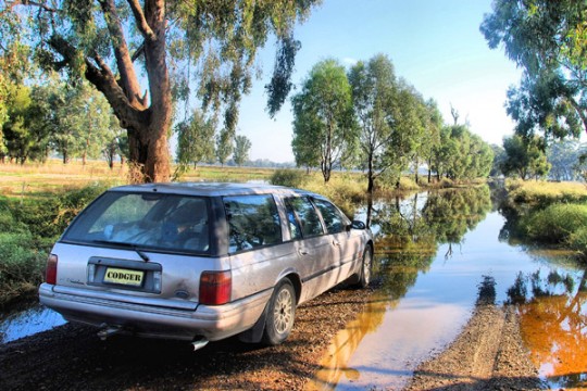 Into the unknown. No All Wheel Drive or differential lock. No snorkel. Standard road tyres. What lies ahead? Will I be out of my depth? Will there be a hole there to swallow the Old Codger and the old Falcon? Just the tip of the aerial showing? Bubbles?