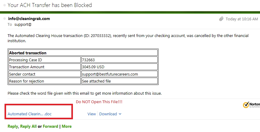 The Subject of the email was along the lines of: Your ACH Payment has been blocked.