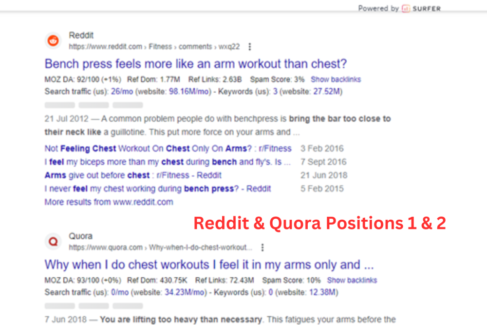 What’s even more interesting is that in positions 1 and 2 on Google (underneath the People Also Ask section) is Reddit and Quora.