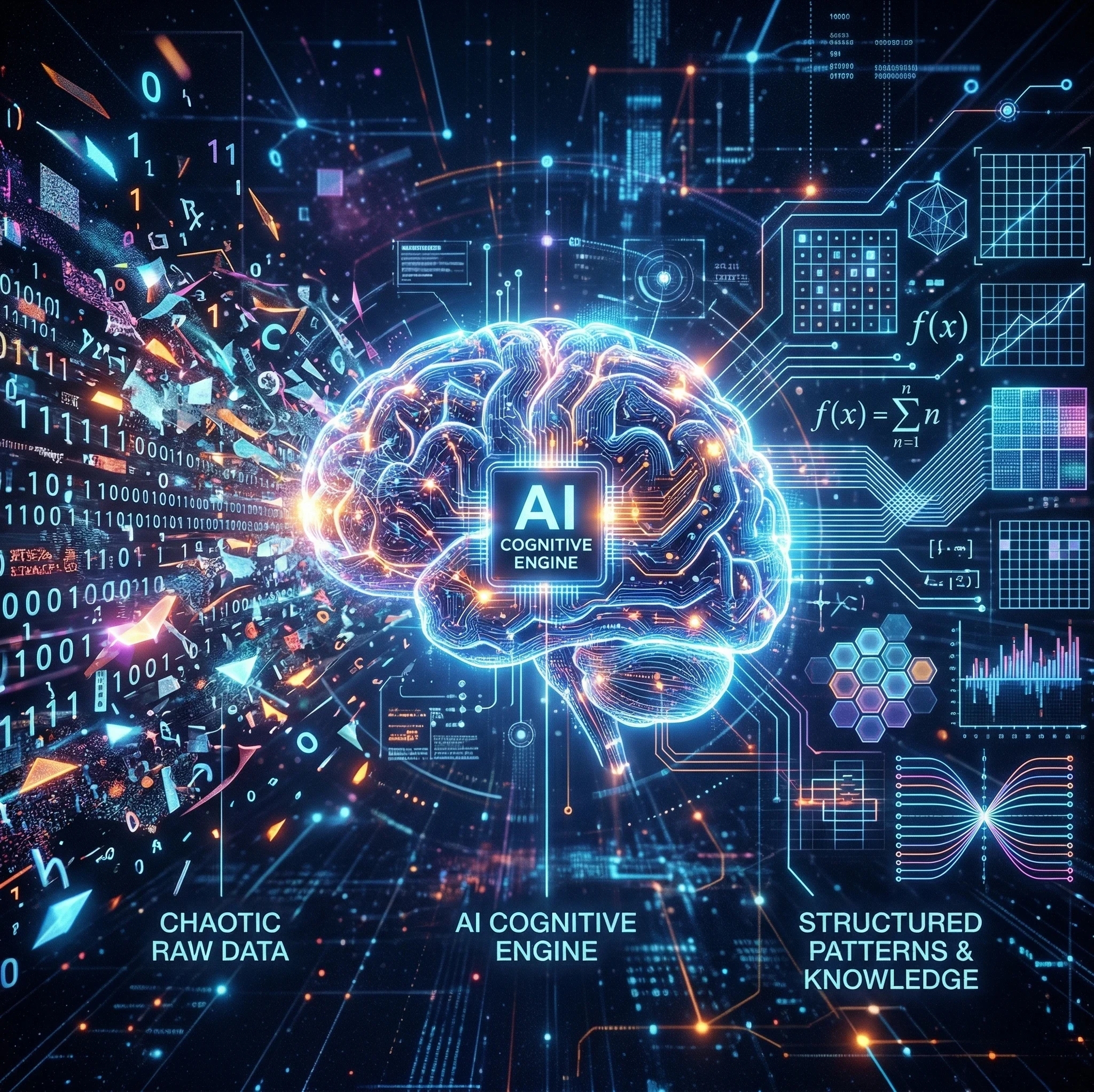 AI brain turning chaotic data into structured patterns, futuristic style”