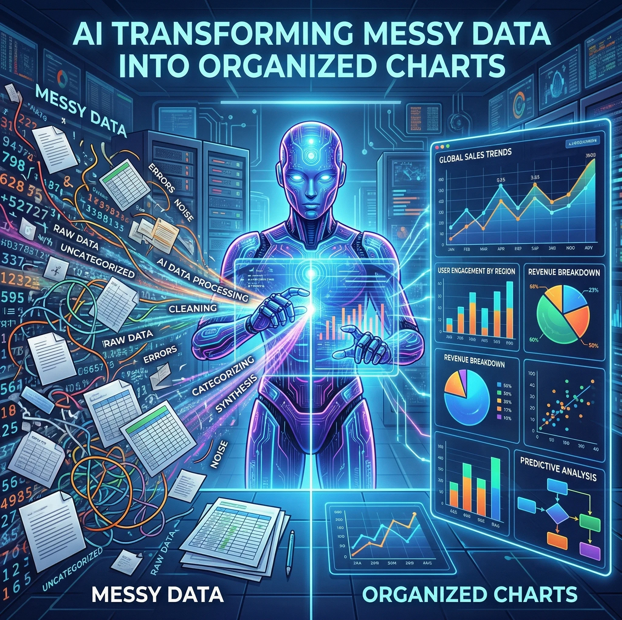 AI transforming messy data into organized charts”