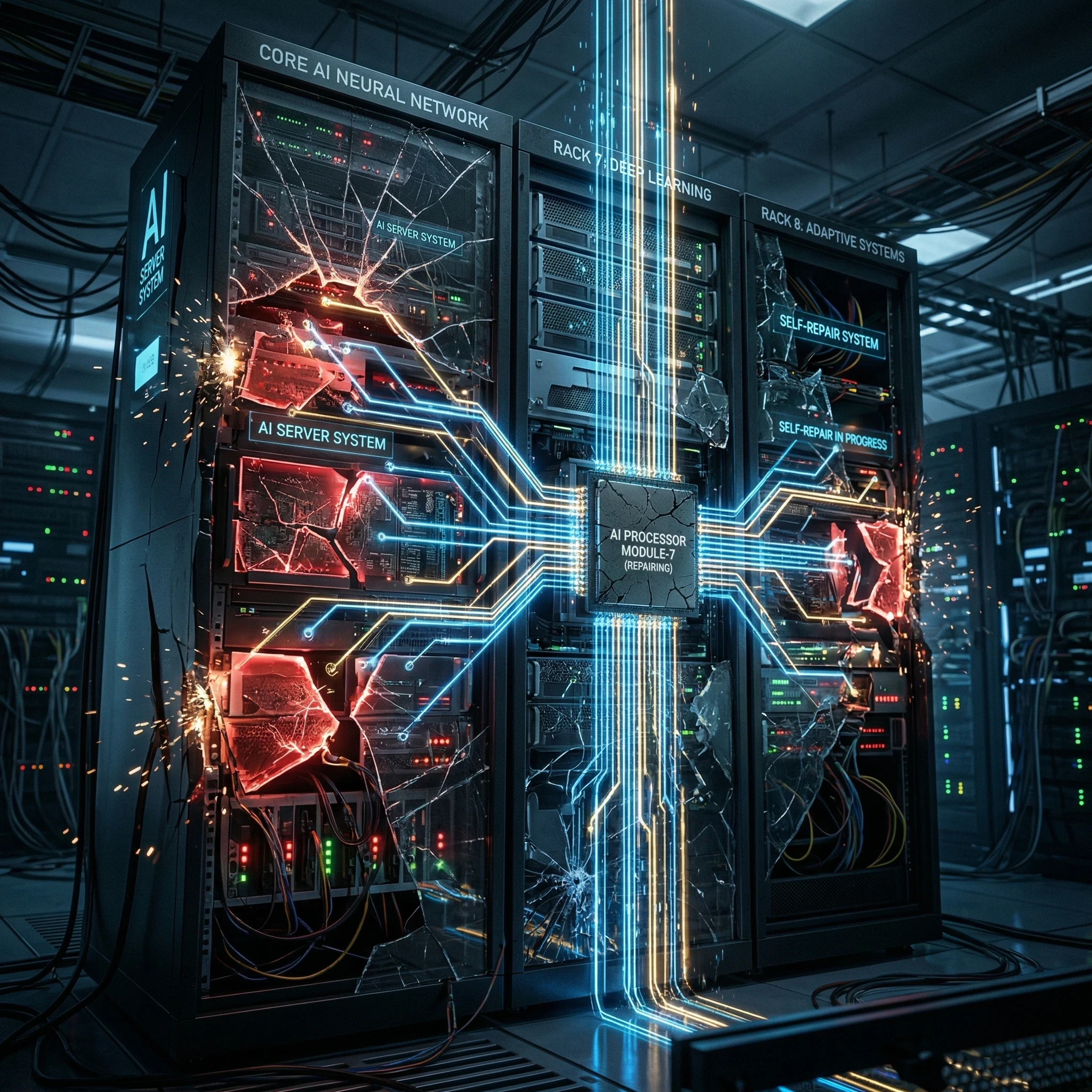 “AI server system breaking and self-repairing with glowing lines
