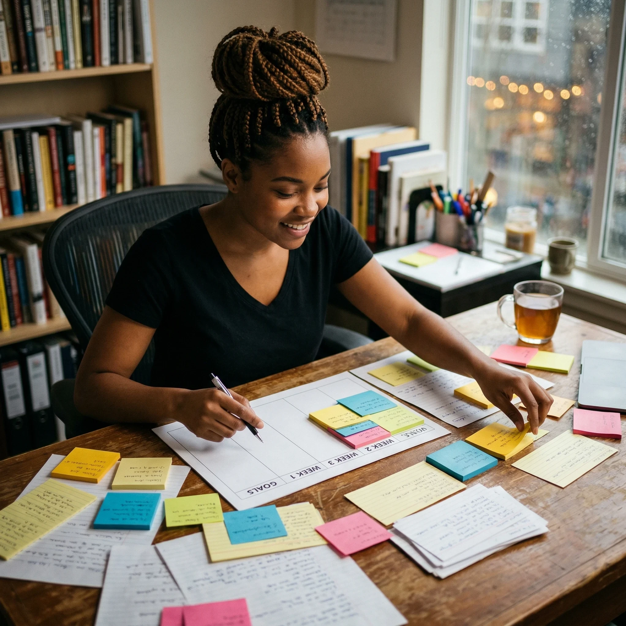 A person organizing scattered notes into a clear plan