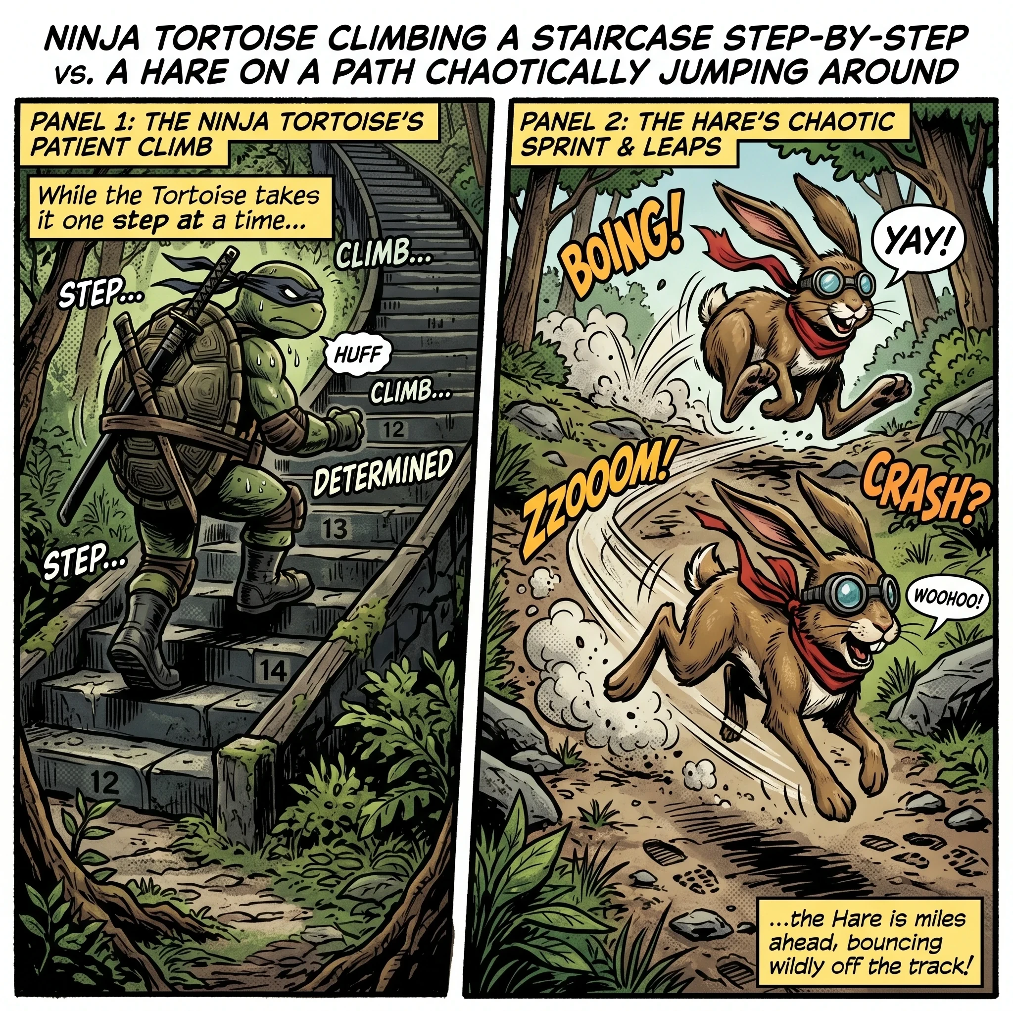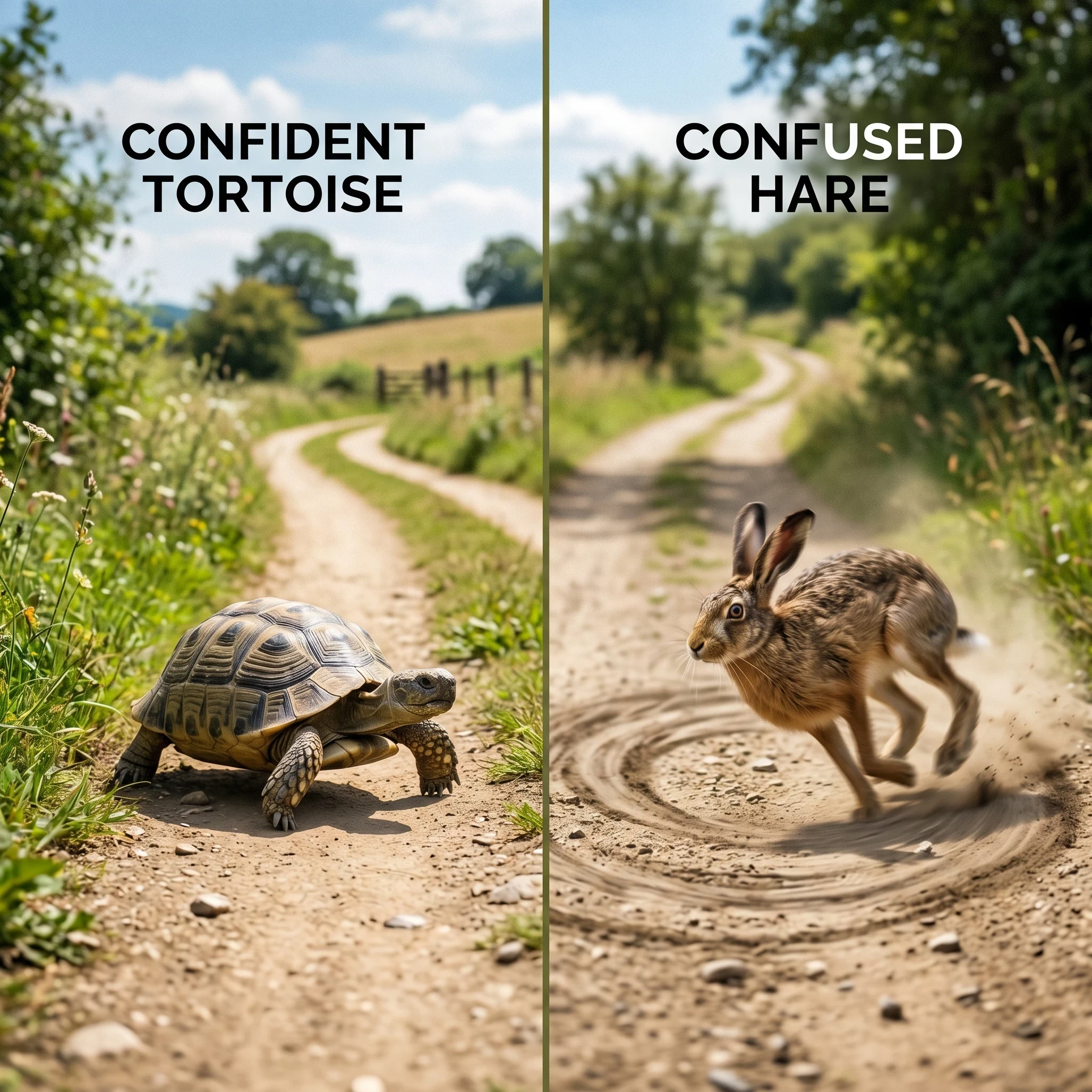 “Tortoise walking confidently on clear path vs confused person running in circles”