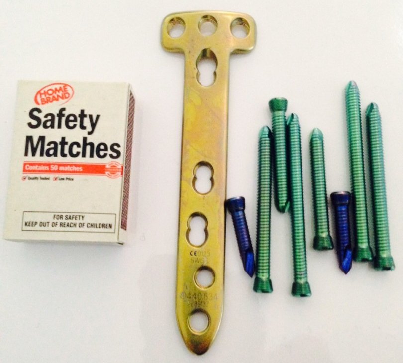 I had the surgery yesterday and I am now back at home starting to recover, my Doctor was great, he had given me the T-Plate & screws that he removed (My spare parts :-D). I was quite shocked, the plate & screws are actually longer than what I expected, simply amazing what they can do. Here you can see just how long it is, I put a box of matches in so you can get an idea of how long it is.
