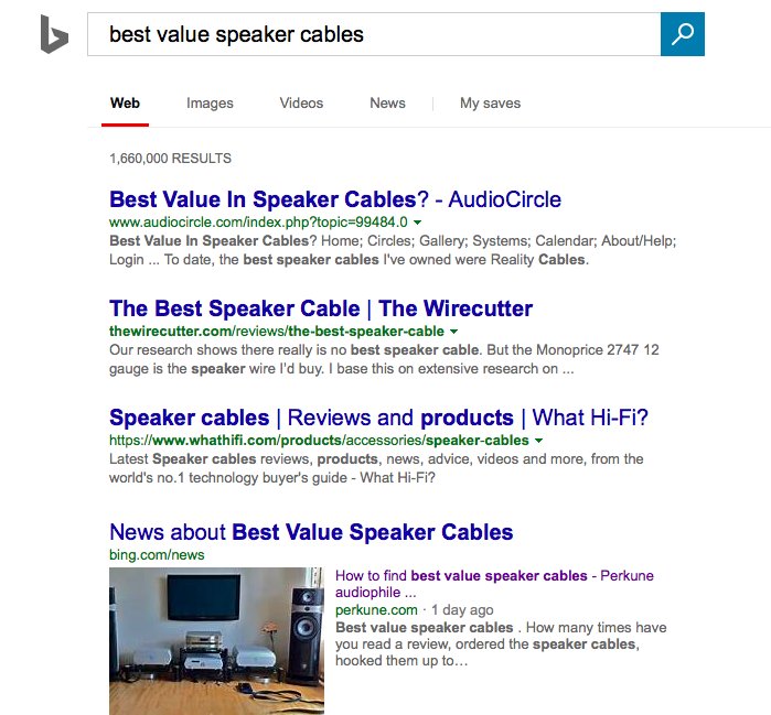 Just for Fun I went to Bing and typed in "best value speaker cables" which was the key word I used in my last blog -