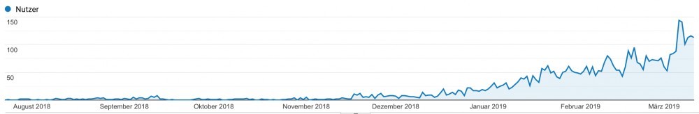 That's the organic traffic right from the beginning, I started the site end of July 2018. As you can see the first 4 months almost nothing happened. I got pretty much zero traffic, then in November things finally changed and organic traffic keeps on growing at least 100% a month.