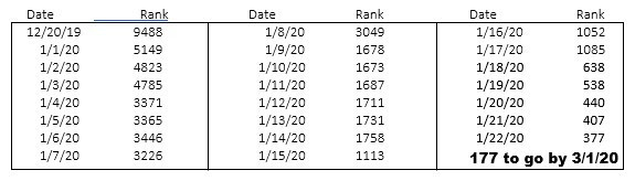 It wasn’t until December 20 that reality set in. I set up my spreadsheet with a goal in mind. Rank 200 by March 1, 2020. Wrongly, I was thinking Ambassadors were the top 200. {DUH -old timers disease}. No matter my goal is still 200. Ambassador will have to wait for a while.