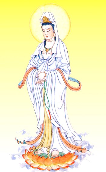 In Buddhism gods are transient higher beings who are still subject to reincarnation, they are not absolute power deities or creators, as in the western use of the term God. Kwan Yin is a rebirth of the bodhisattva Avolikiteshvara, a monk who was reborn in a heavenly realm and filled with compassion for all living beings. One legend states that Avolikiteshvara chose to be reborn as a beautiful woman to marry a renowned king and convince him to become a Buddhist.