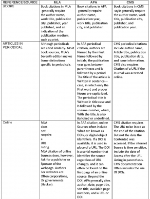 In order to be safe, it is a good idea to familiarize yourself with APA, MLA and CMS formatting styles. These acronyms provide different methods for source documentation for authors, bloggers, students, people, etc. Briefly, APA stands for the American Psychological Association; and it provides methods for source documentation across various media (written, video, Internet) that is used in most social sciences courses. MLA stands for Modern Language Association; and it provides methods for source documentation that is used in most humanities courses. CMS, or the Chicago Manual of Style, provides methods for source documentation that is used in most history courses. I have created a small table to show some basic ways to give credit to your source documentation/s. There is a link at the end of this post to view the full Citation Chart provided by Purdue OWL