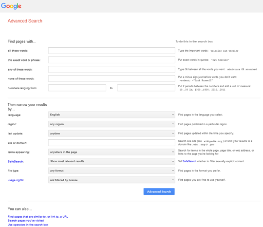 Google offers an advanced search page at https://www.google.com/advanced_search that handles the special codes for many of their advanced operators. Just fill in the blanks, and cut Google loose. There's even a similar site for advanced image searches on Google - check it out at https://www.google.com/advanced_image_search