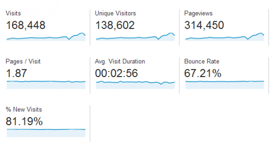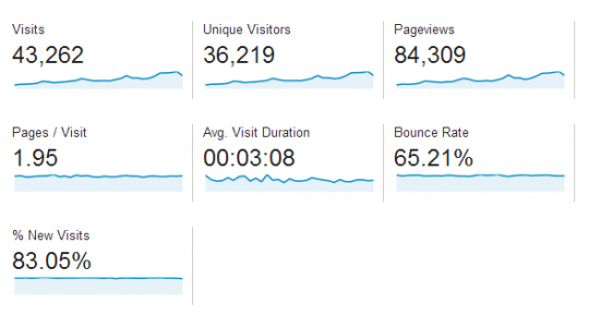 Looks a little shy of quadruple but I lost my plugins for a day and missing about 6,000 visits from the Sunday before last. My goal was 172,000 and I reached it with almost the same results as far as average time on page and bounce rate.