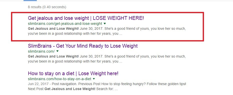 I'm using Chrome, so I opened incognito window, and search Google for "Get Jealous and Lose Weight" and the result was: