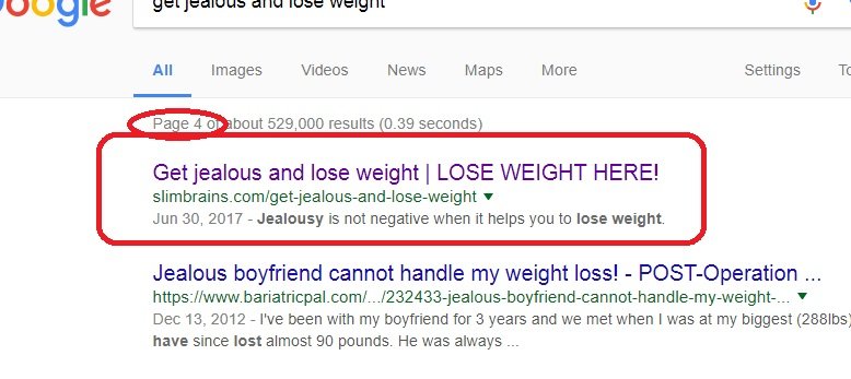 I'm so glad to tell you that my post "Get Jealous and Lose Weight" has ranked on the 4th page on Google search results without quotation marks: