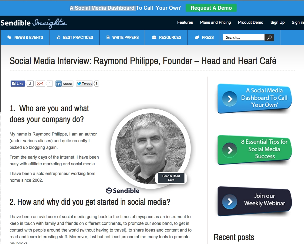 In my first blog post I mentioned that one of my personal goals was being more social, more extrovert. Well I got interviewed by the Sendible (A Social Media Dashboard) website as an "expert". How cool is that. The interview can be read here http://sendible.com/insights/social-media-interview-raymond-philippe-founder-head-and-heart-cafe/