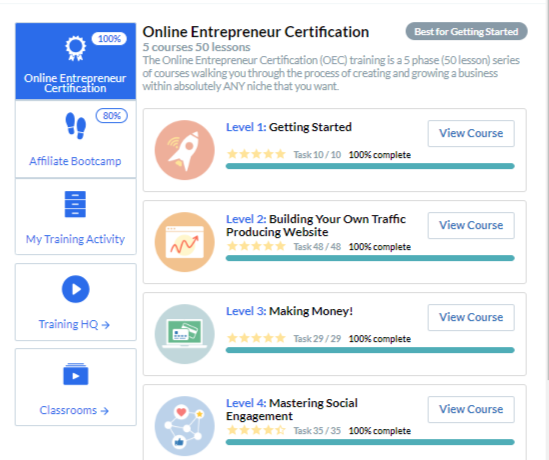 Wealthy Affiliate’s Online Entrepreneur Certification (OEC) consists of 50 core lessons across 5 progressive levels, with 10 lessons per level:
