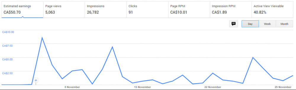 I implemented Adsense on Nov 4th, 2018 and for that whole month, I made $50.70 CAD (about $38.52 USD) which wasn't so bad! It was definitely more than what I was used to making, especilly since I hadn't had any WA sales at that point.