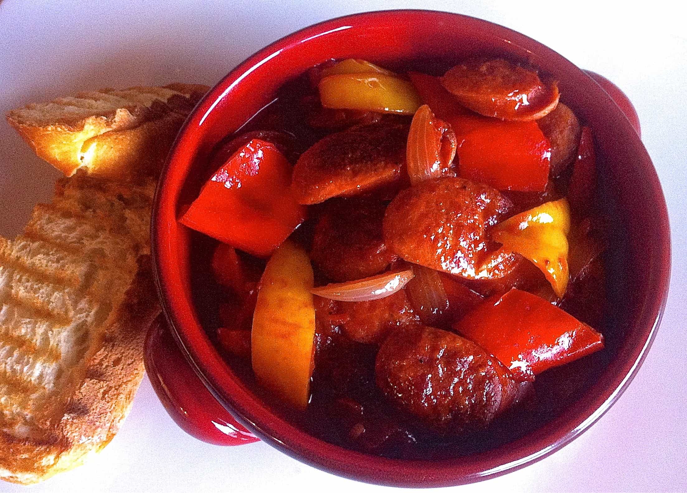 Spetsofai is a Greek dish, one can find in many variations. The famous spetsofai from Pelio contains aubergines, while in most areas, it is prepared with green or multicoloured mild bell peppers, or spicy peppers hot enough to make your eyes tear! (If using mild sausages, spice it up with some red hot chilli peppers and hot paprika and be generous with the seasoning. If using spicy and salty sausages, then use mild peppers and watch out the seasoning.)