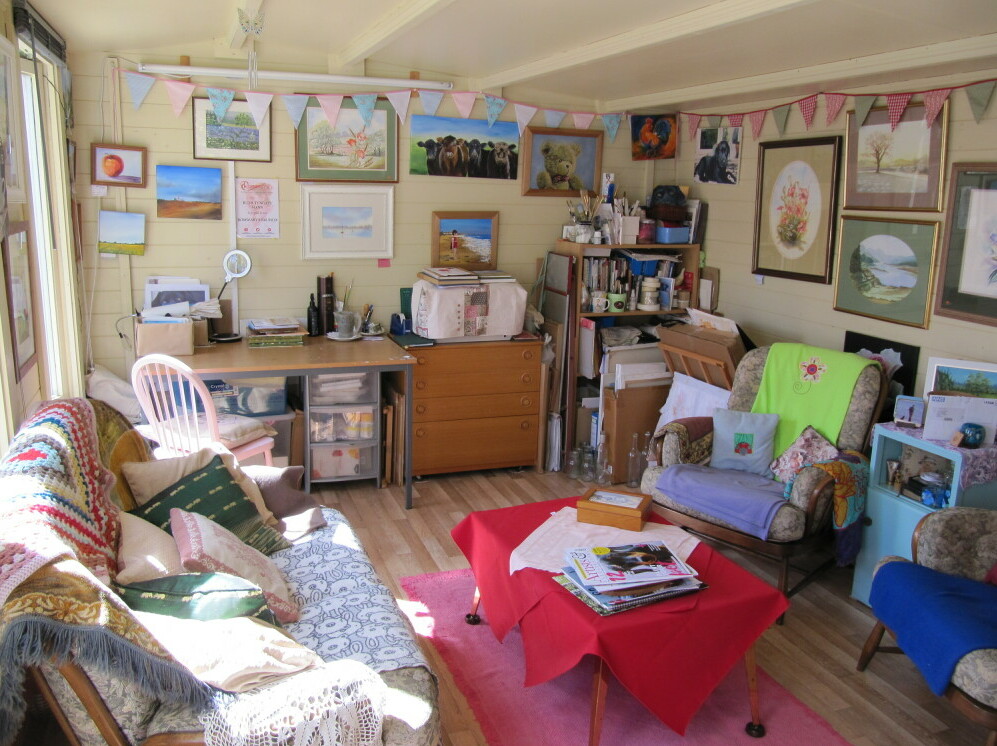 I have a summerhouse in my garden which is my studio where I can play with paints, make a mess, plug into my music and get lost in a world no one else knows about. A world that is also absorbing! Also it's not usually as tidy as in the photo!!