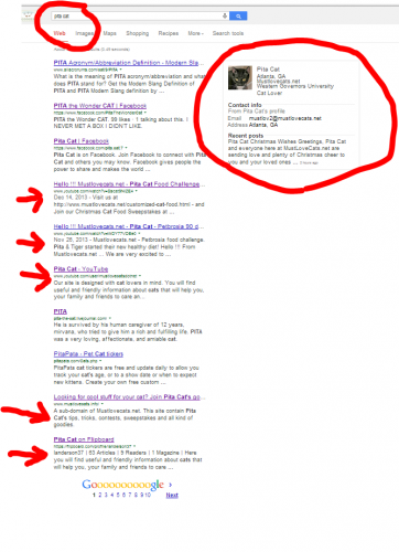 In addition, We are holding 5 out of 10 spots on the 1st page of Google for a search of: Pita Cat