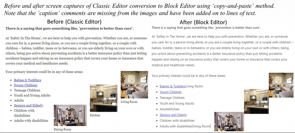 If you have images in a post (or page) that was created with Classic Editor that you have a given 'caption' (descriptive title) to, when you want to convert from Classic Editor to Block Editor there are two ways to do it. One method is to do a simple copy-and-paste and create a new post in Block Editor and the second is to use the 'Switch to Block Editor' option. Because I wanted to play safe and preserve my Classic Editor version of my posts which were already on my website, I did my first couple of 'conversions' using the copy-and-paste method, and discovered that the captions had become text tacked onto the right-hand end of a line of text on the page, something I didn't notice until after I had published the updated post.