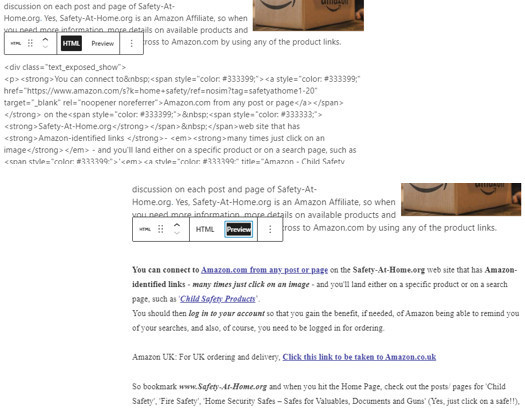 Instead of your text you see HTML; don't panic. Click on the 'Preview' button that's right alongside the HTML (that's in reversed white on black) and, voila, your text reappears. The only downside is that you do have to do this for each block individually, unless anyone else knows how to do multiple blocks in a single action... (In my post, the one these two screen shots on, most of the document was in preview mode, just a few appeared in HTML.