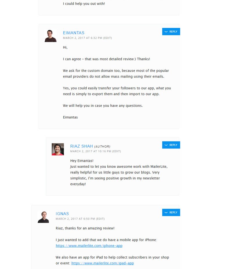 I recently did a review on an Email Autoresponder called MailerLite and just one day after I published my review, I got comments from both the owners thanking me!