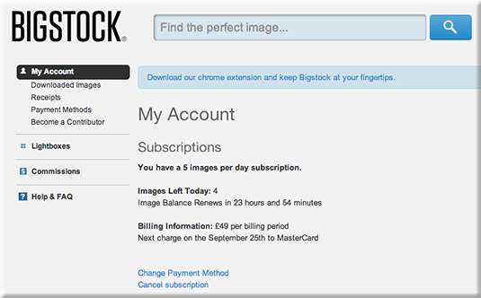 It's therefore ESSENTIAL to set several alerts to remind you to CANCEL your trial the day before it's due to bill, in my case I'd need to cancel on September 24th. To cancel, just log in to your BigStock account, go to My Account and click the blue Cancel subscription underneath the renewal date.