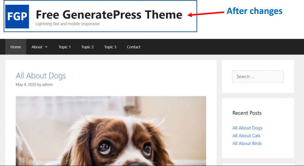 This is where you can change your website name to whatever you want. My site title is "Free GeneratePress Theme"