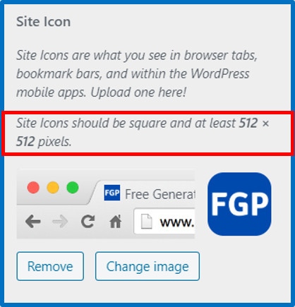 The recommended size for site icons is at least 512 x 512 pixels and must be squared.
