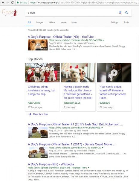 Similarly, if you typed "a dog and a cat", It would search for dog, cat and ignore a and a. It would draw all the results and sort them according to page rank, popularity, and links, etc. But when it showed results they would contain all the stop words shown in the lists.