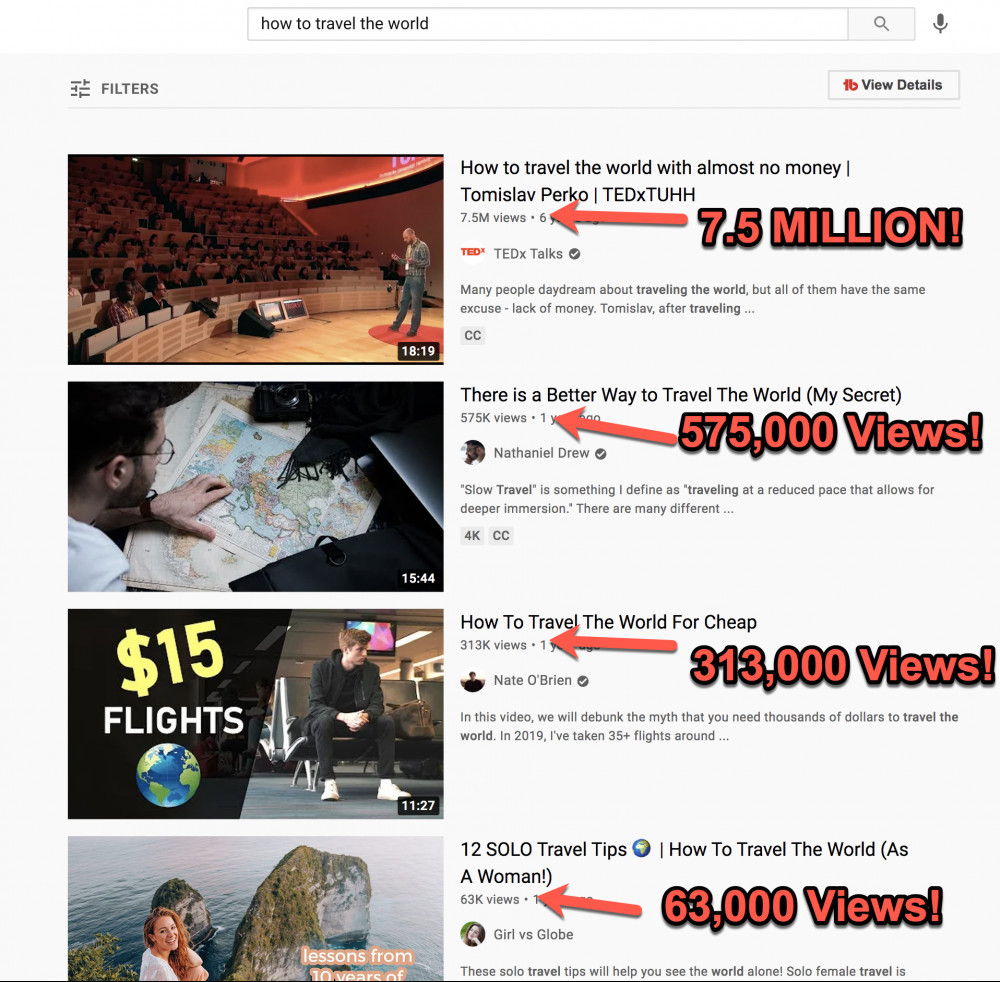 For example, "how to travel the world" seems to be an ultra-popular and therefore a good topic for a YouTube video/channel.