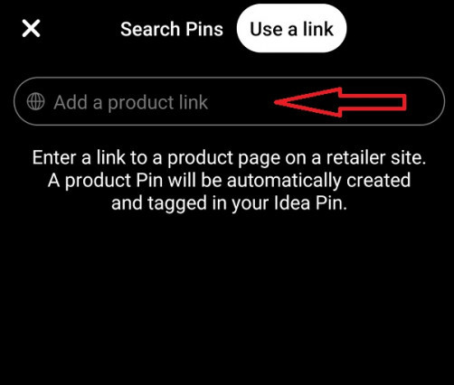 So you can add your idea pin either from your camera roll or by recording a video/s using your device. Select your files, and then simply click next, and at the bottom of your screen, you will see the product tag, click on it and then choose to use a link.