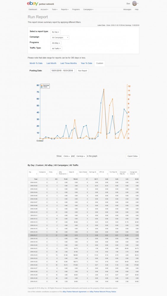 Along with what I mentioned above, I have already started making some money by providing eBay affiliate links on my website in addition to forums where the game is discussed (where I have been active since 2011, long before I knew what affiliate marketing or WA was), and the game's two Facebook groups. This has worked out well, as I have totaled about $106 from May through October so far this year! This has been a great motivator going forward as I now see that "it works". :D It's not a lot, but here are my earnings from October in this tiny niche from reasonable effort and not all that many links: