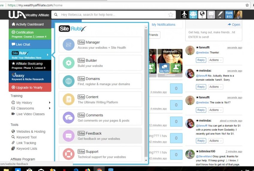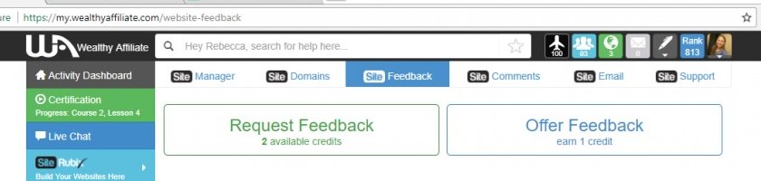 need more help?: The side bar is available on the left side of the screen on all pages of the Wealthy Affiliate website. When you select the SiteRubix tab, a list of seven options to maintain your websites appears. SiteFeedback is sixth option, or the second from the bottom. SiteComments looks similar to SiteFeedback, so make sure you are in the section that you intended.