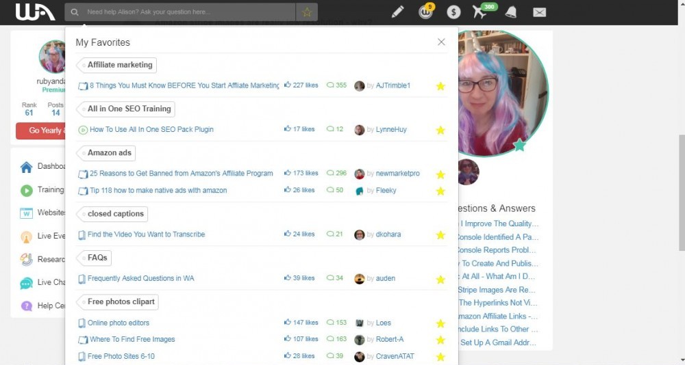 One thing I started doing,, I use Google chrome on my PC and set up a folder for WA divided into sub-folders where I save a lot of the training's I read. How to's, TOOLS, and Community members websites if I need to refer to them.