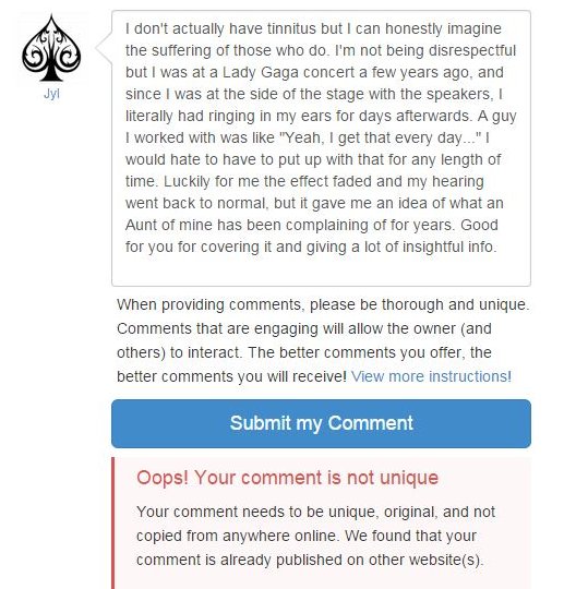 The Lady Gaga "not unique" message is intriguing!? How does the system assess uniqueness of the comment? Just by the name Lady Gaga? Concert? Buzzing in the ear? I'm sure many have thiss problem when they go to a concert.... Strange....