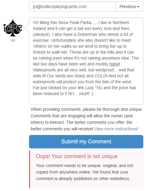 I am so tired of this. I have wasted a lot of time trying to leave comments that were absolutely fine only to have them rejected for not being unique. I wish they would fix it.
