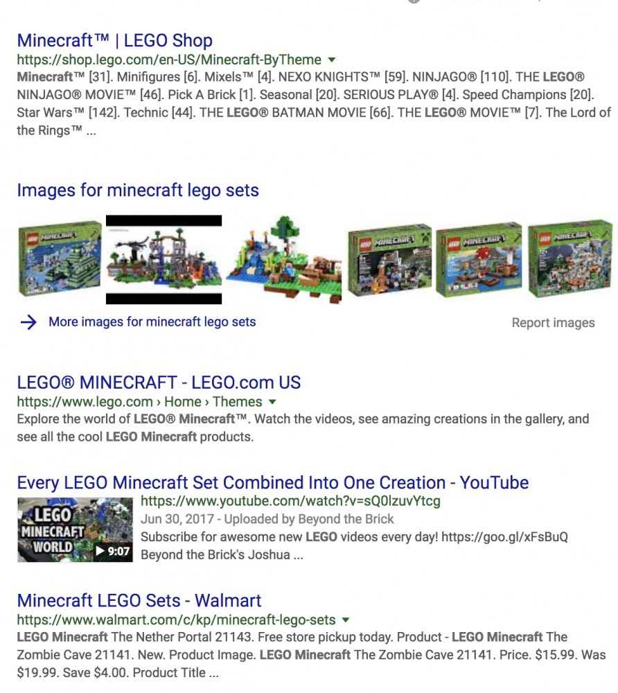 So I dug deeper and found every single time I searched for a physical BRAND NAME product, the #1/first few were always the manufacturer. So "minecraft Lego sets" yields not surprisingly; Lego.com as the top dog and several positions below that too. Pretty logical: