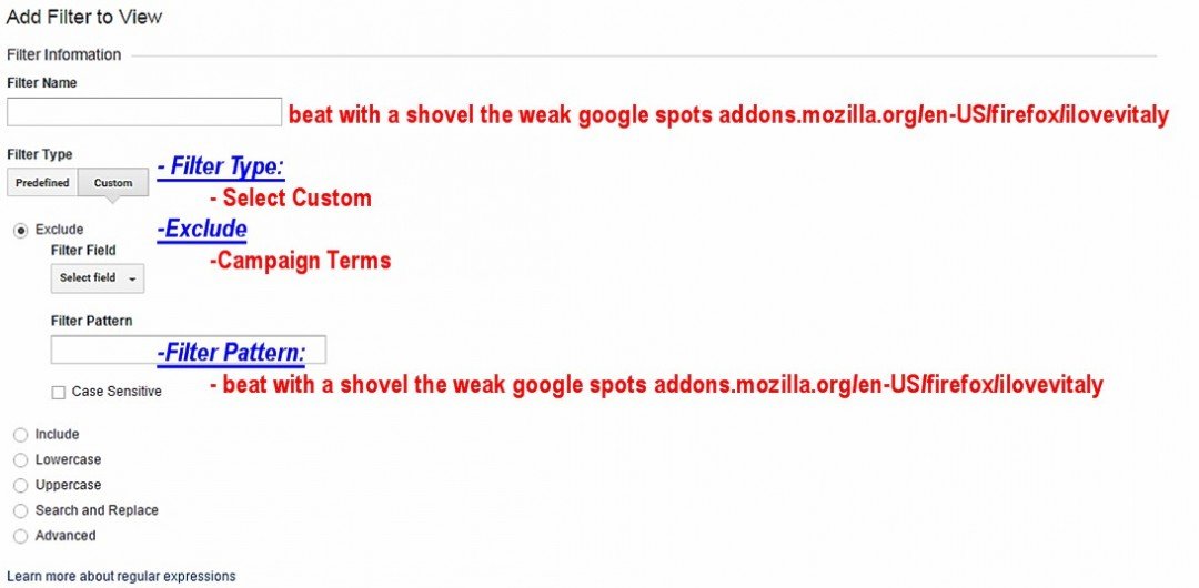 - In Filter Type choose Custom Filter > Exclude Filter > Field: Campaign Term >Filter Pattern: Enter “beat with a shovel the weak google spots addons.mozilla.org/en-US/firefox/ilovevitaly” and click Save at the bottom of the page.