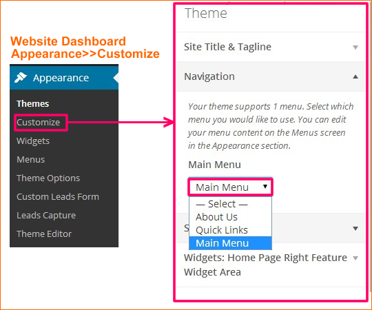 NOTE: Please make sure that you have selected the correct MAIN MENU in Appearance>>Customize>>Navigation