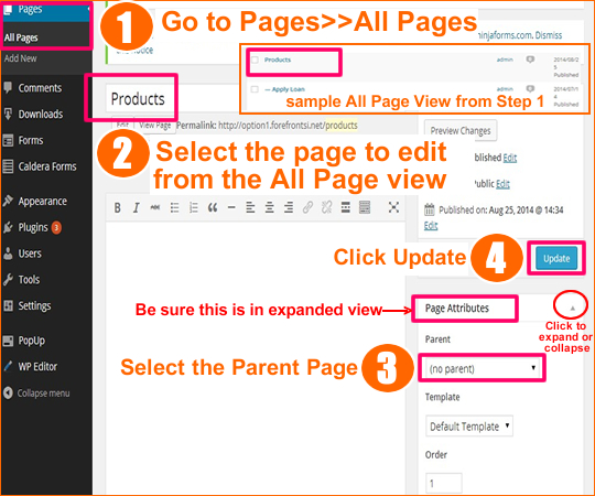 - Select the page(intended to be part of the sub-menu) to edit from the ALL Page View.